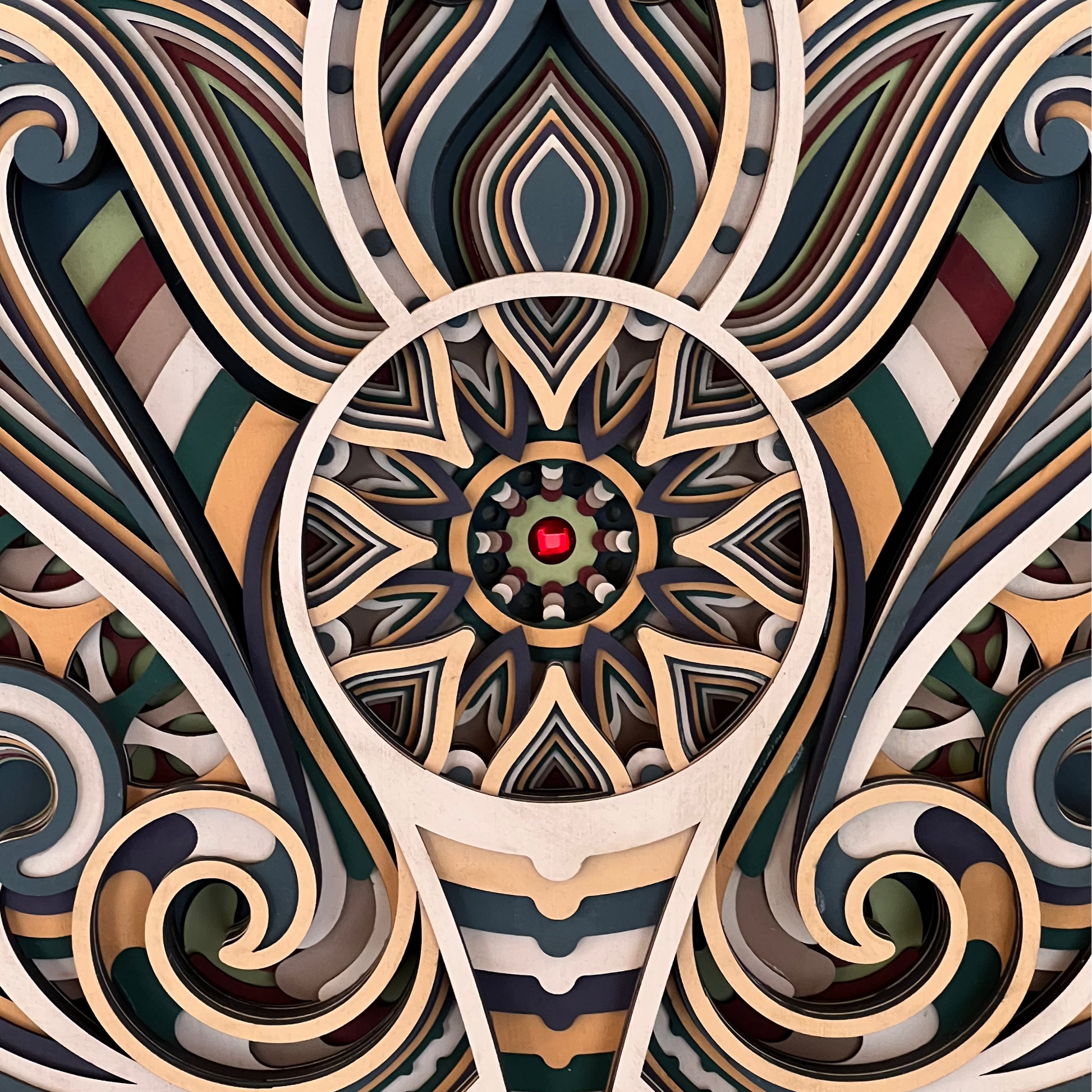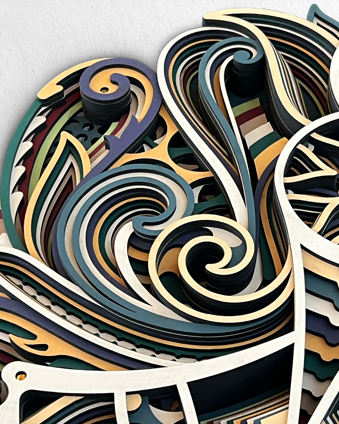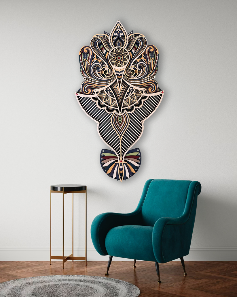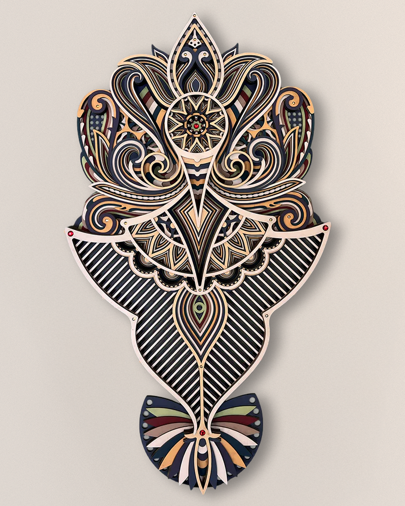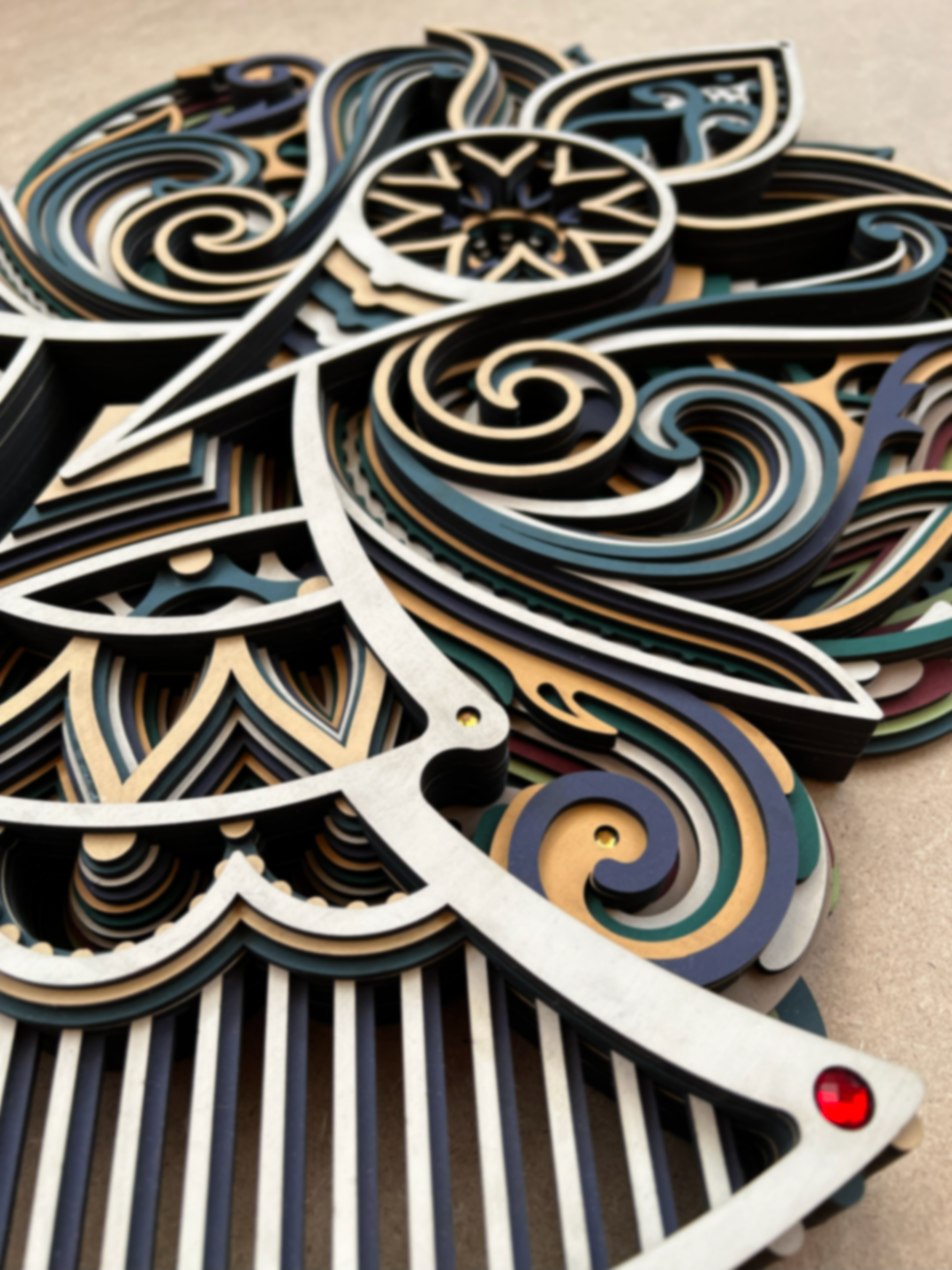 Inspired by the forest, Zyra follows a journey from the woods and back again. Her name, derived from a word meaning “seed” or “to flourish,” reflects the piece’s organic growth and natural rhythm. If you look closely, you can see through her in some areas, deliberately left open to reveal depth, light, and shadow.