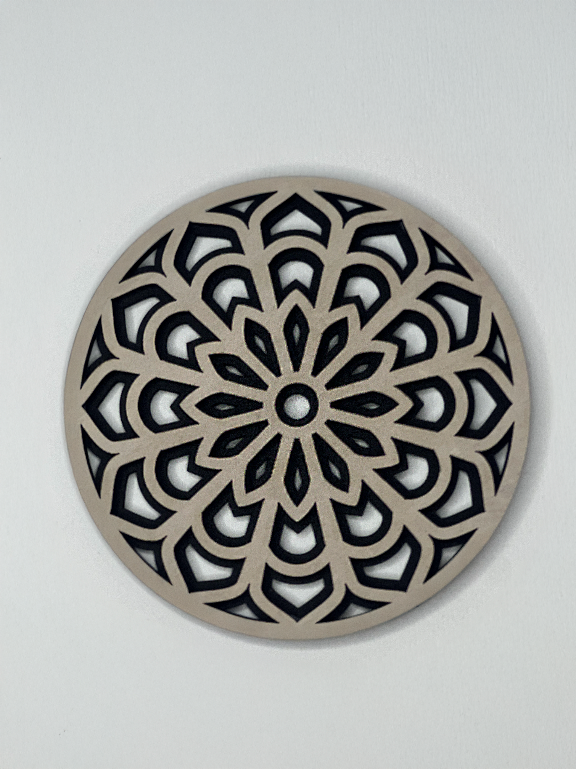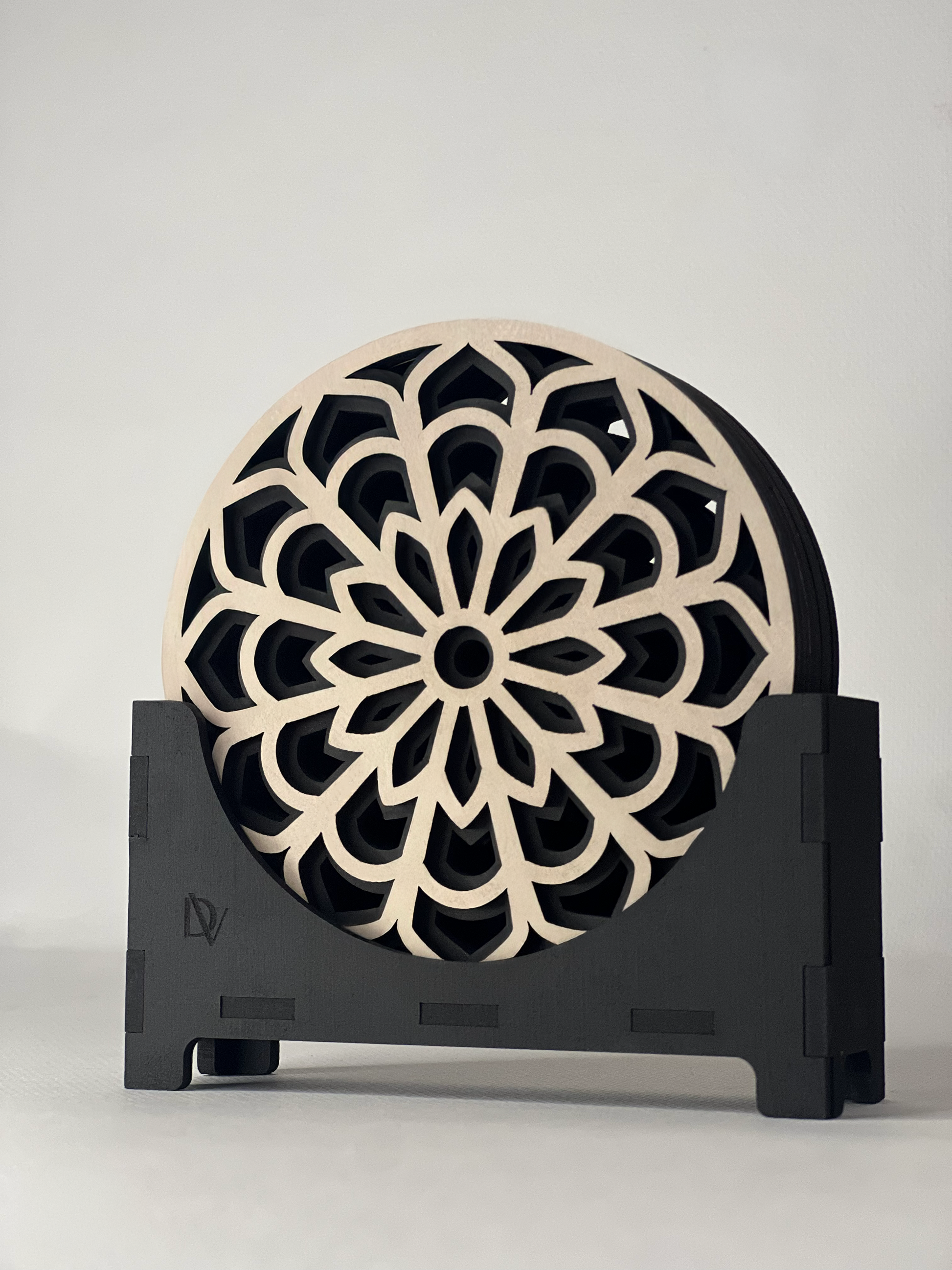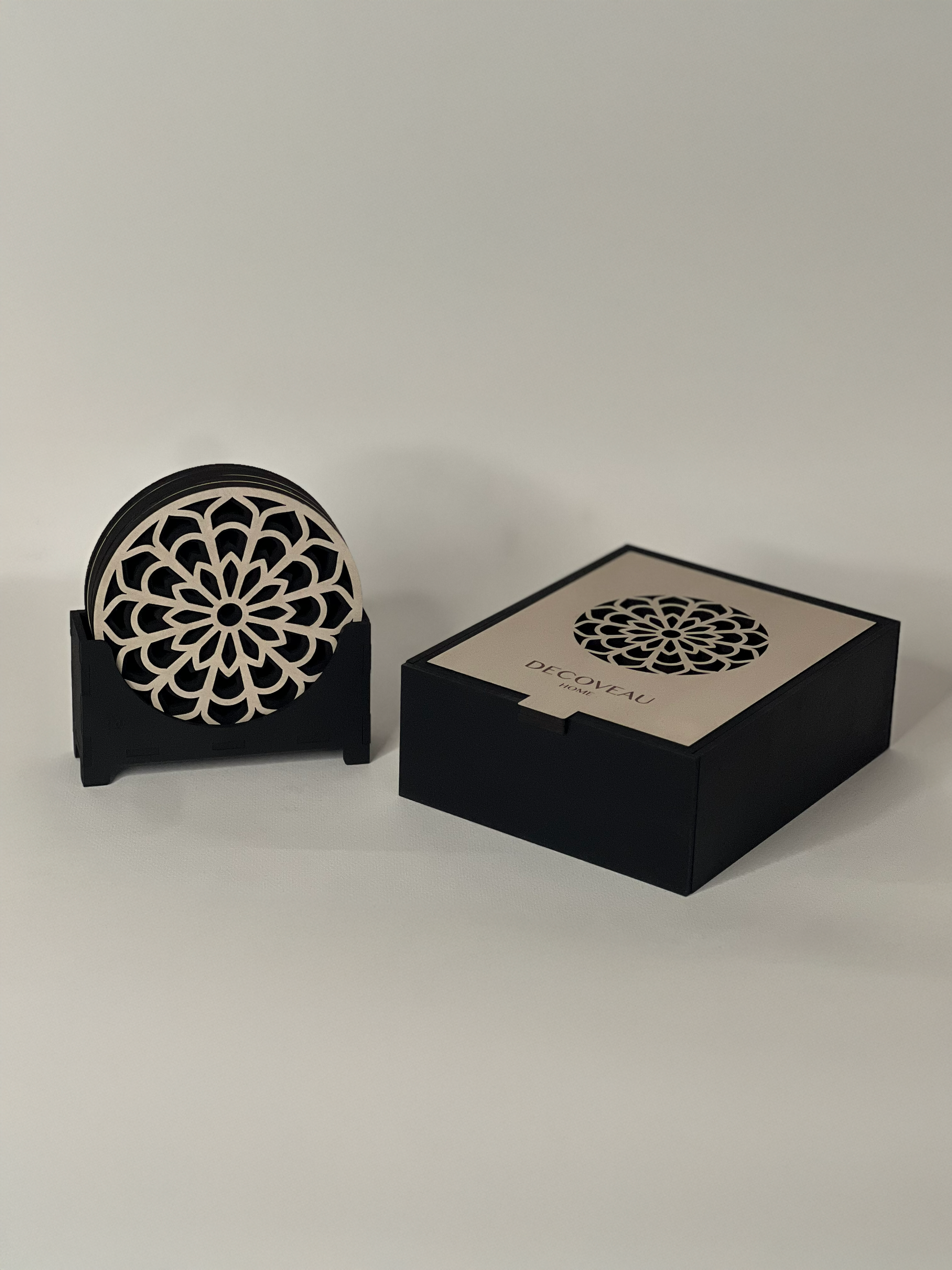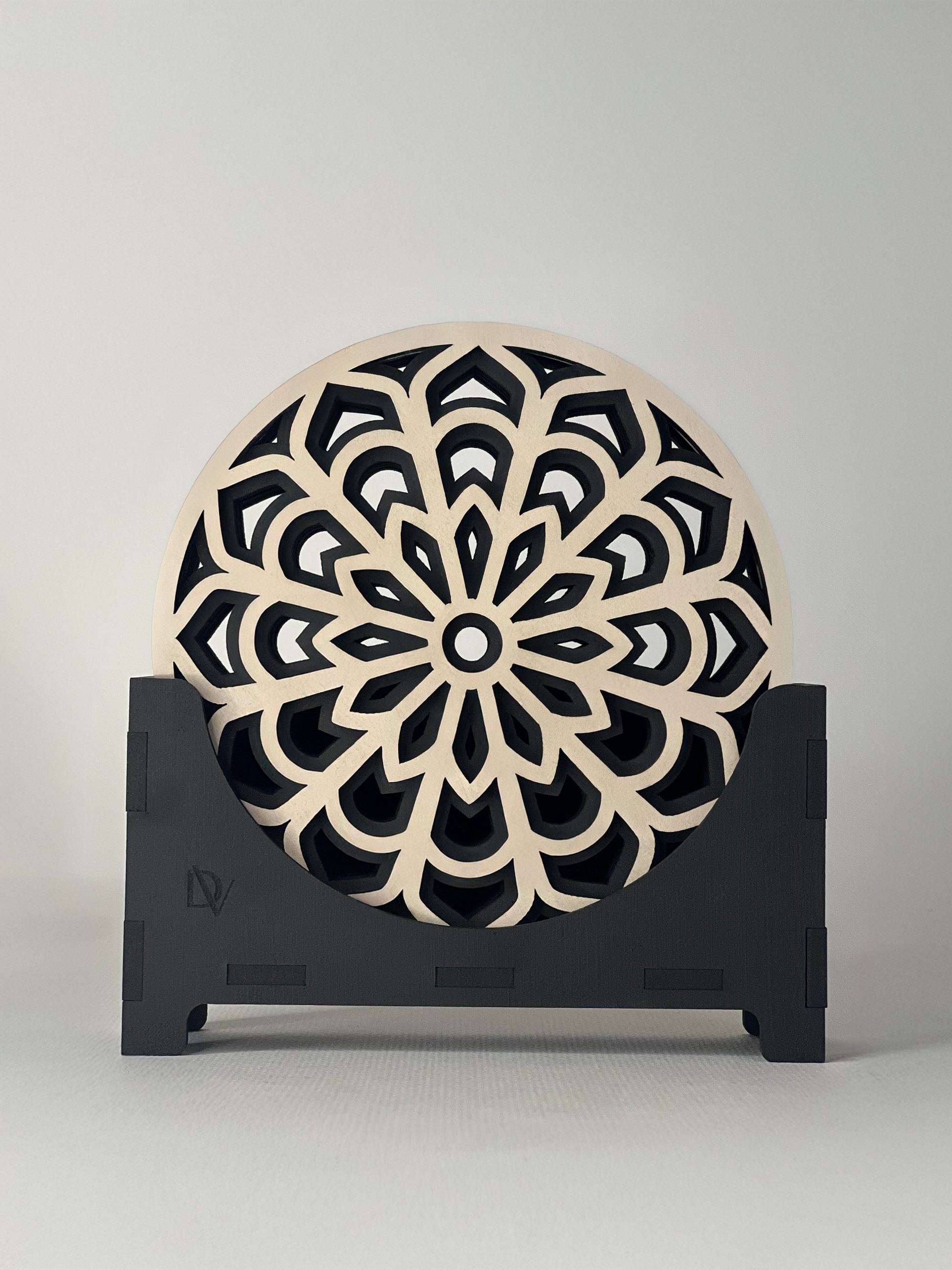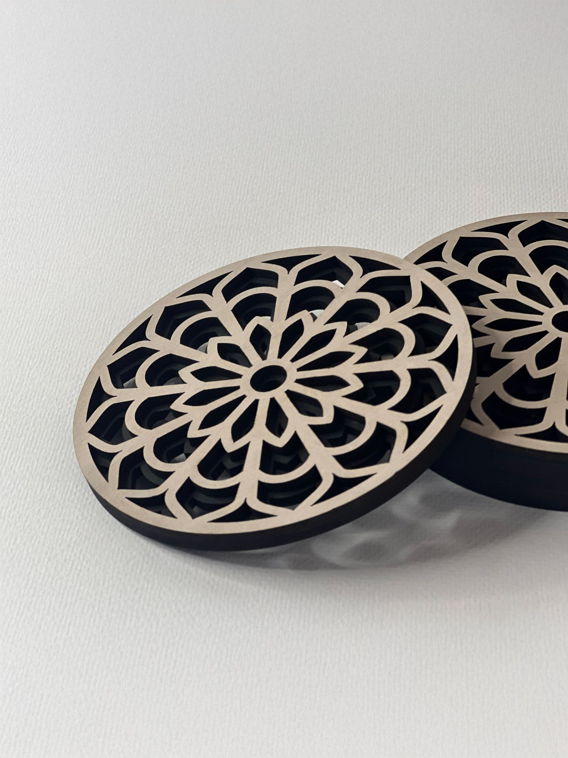 Bring artistry and function together with these intricately designed double-layered wooden coasters. Each piece features layered geometry inspired by nature and crafted with precision, turning a simple object into a statement of craftsmanship.