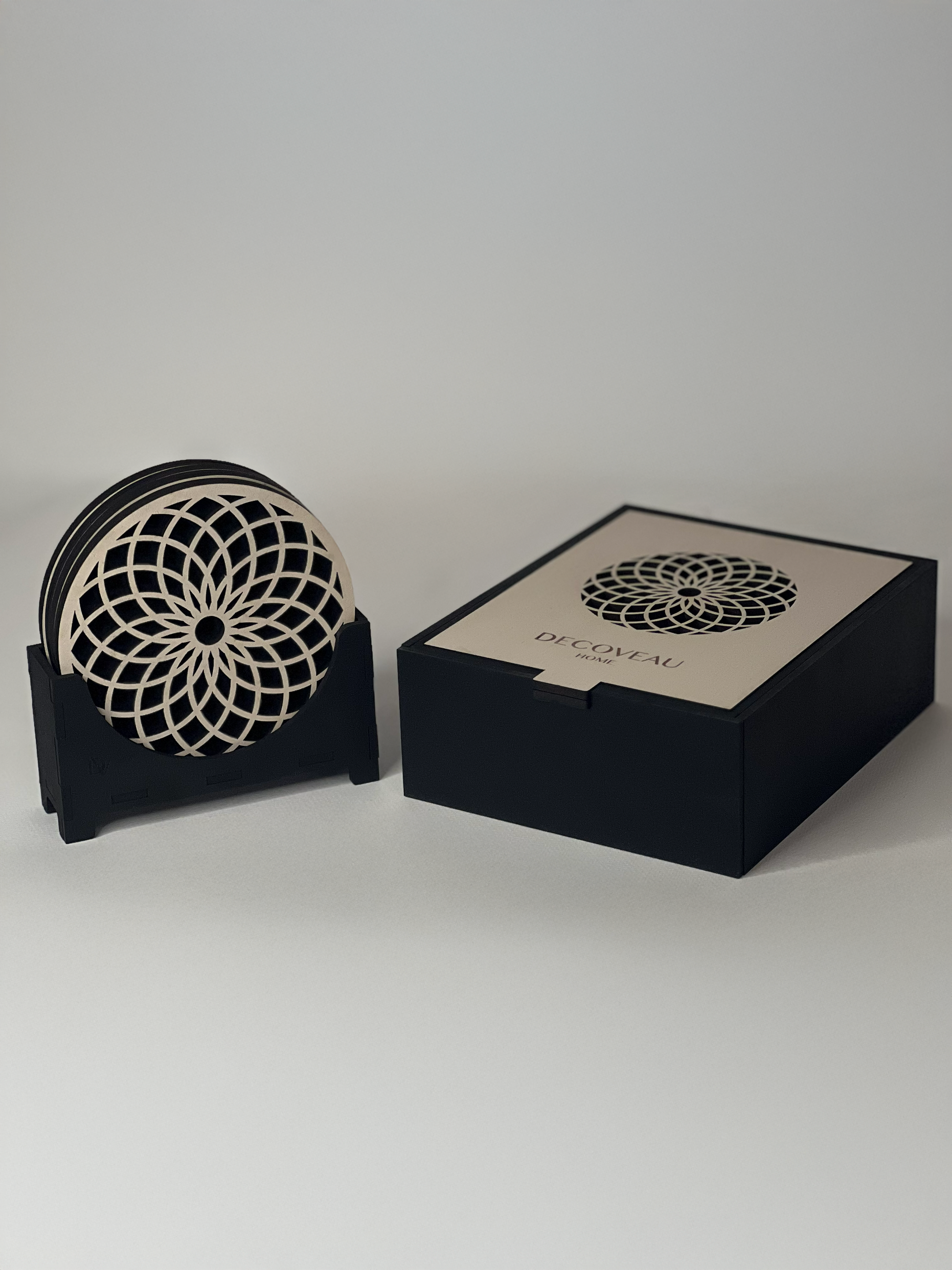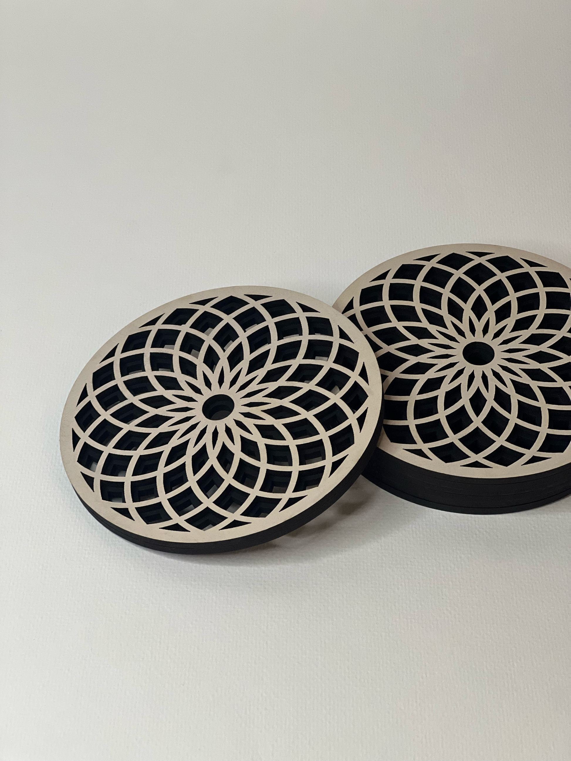 Bring artistry and function together with these intricately designed double-layered wooden coasters. Each piece features layered geometry inspired by nature and crafted with precision, turning a simple object into a statement of craftsmanship.