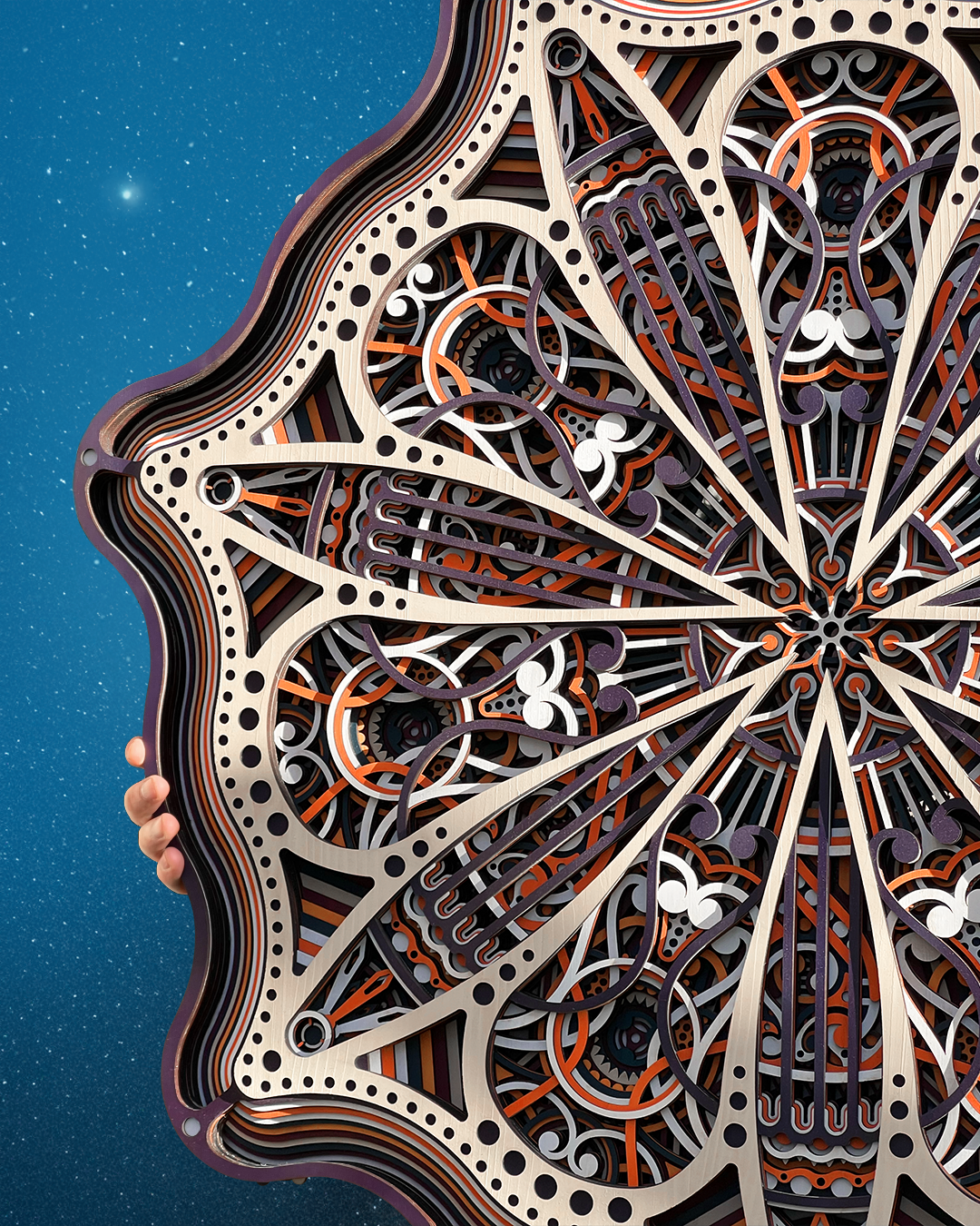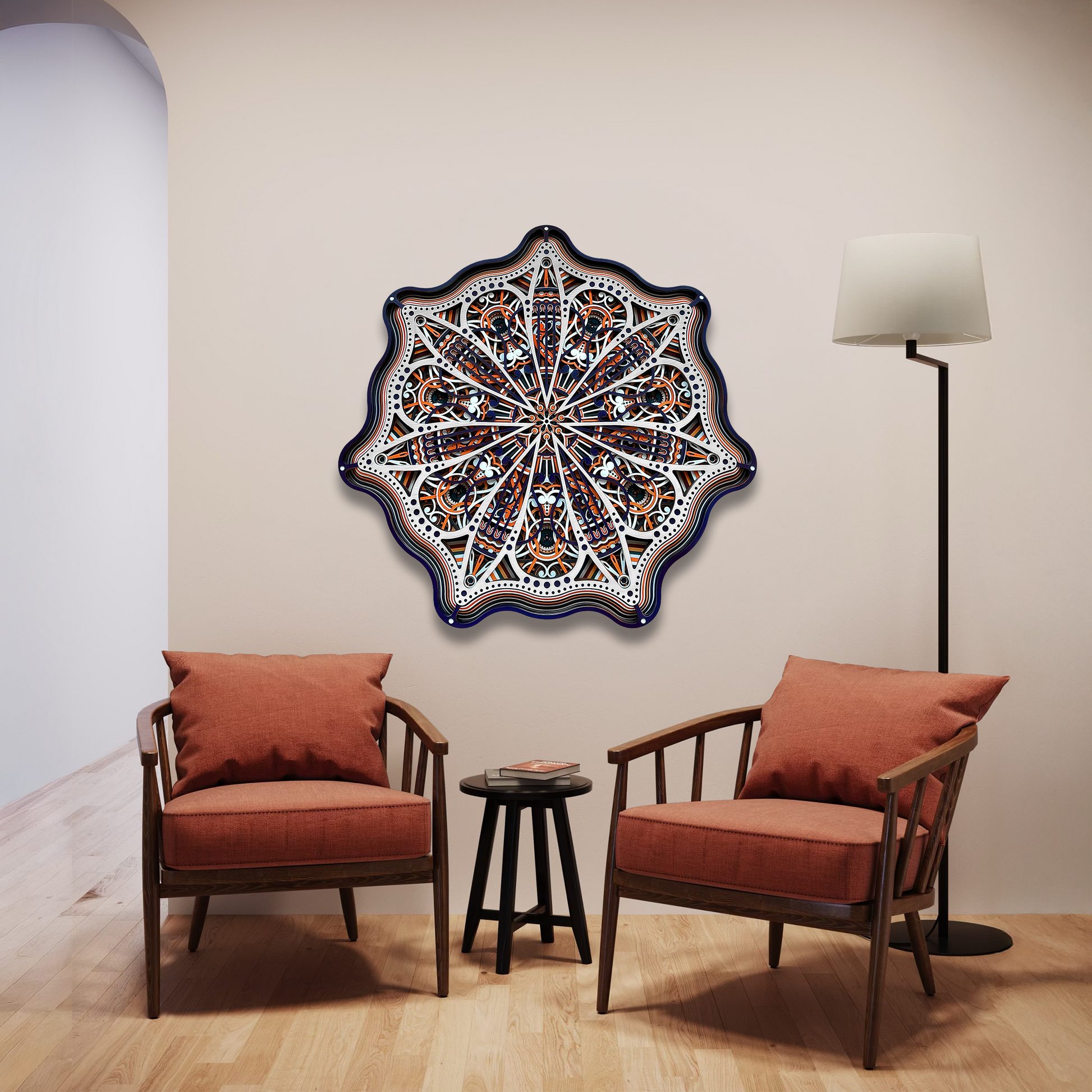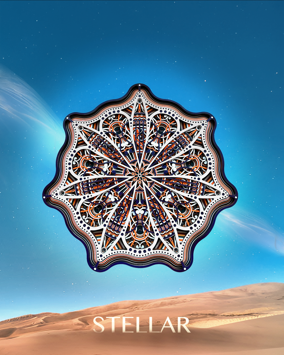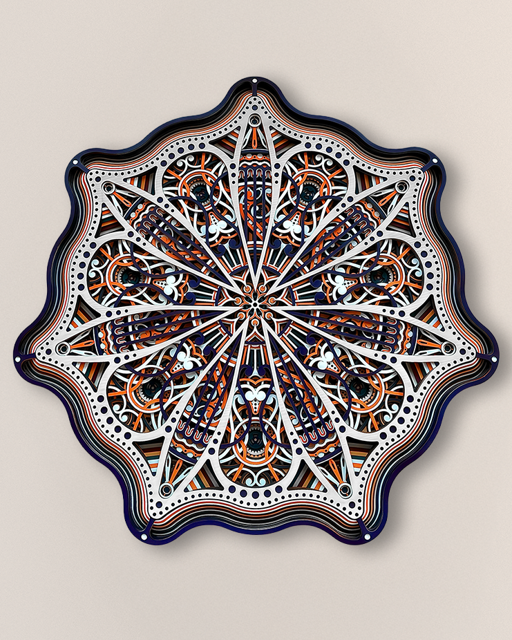 An artwork inspired by the seven-pointed star of Jordan, a symbol of pride. Its layered design guides the eye across intricate geometry, creating a sense of movement and discovery. The piece feels striking from a distance, yet continues to reveal delicate details as you explore it more closely.